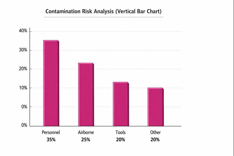 Carta bar menegak menunjukkan bahawa pergerakan kakitangan menyumbang paling banyak kepada pencemaran silang dalam bilik bersih, menekankan cara berpakaian dan pengendalian lap yang betul.
