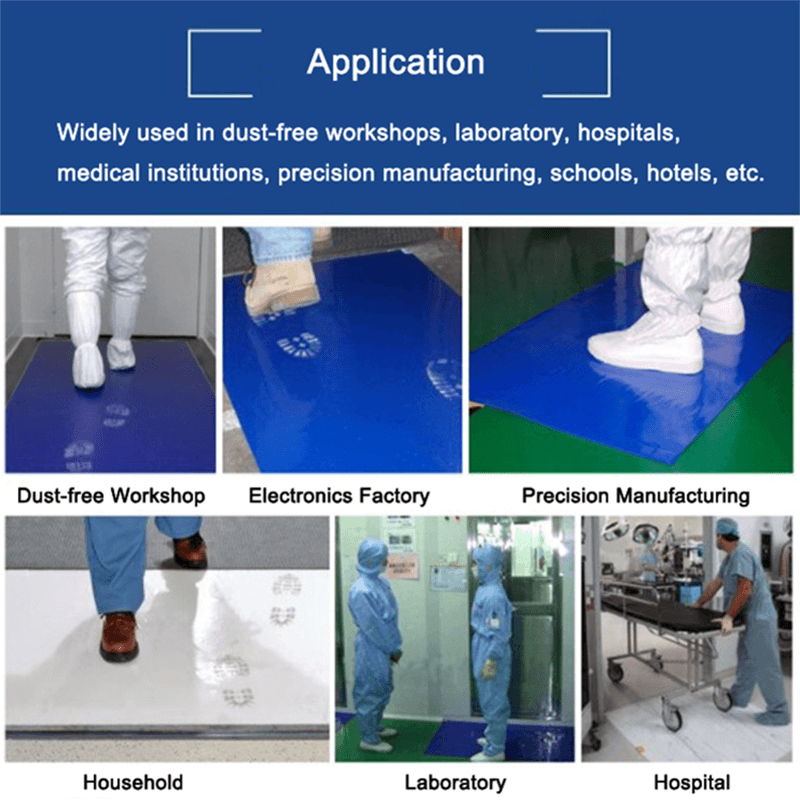 Bilik Bersih: Dalam persekitaran bilik bersih, adalah penting untuk memastikan lantai bersih. Tikar melekit kami dapat menangkap bahan pencemar dari tapak kasut dan roda peralatan, membantu mengekalkan piawaian kebersihan alam sekitar dan memastikan operasi bebas habuk proses pengeluaran.